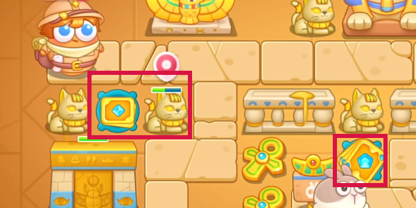 5、狮身兔面像释放出来的炮台要全部卖掉,然后继续锁定攻击。并且在其右侧放置卡牌并进行升级。在第三次将狮身兔面像击败以后,它就会变成石像。此时,右上角的卡牌继续升级,将右侧附近的障碍物全部清理掉,同时也要将狮身兔面像放出来的第三次炮台全部卖掉,以优化资源配置和防御布局。