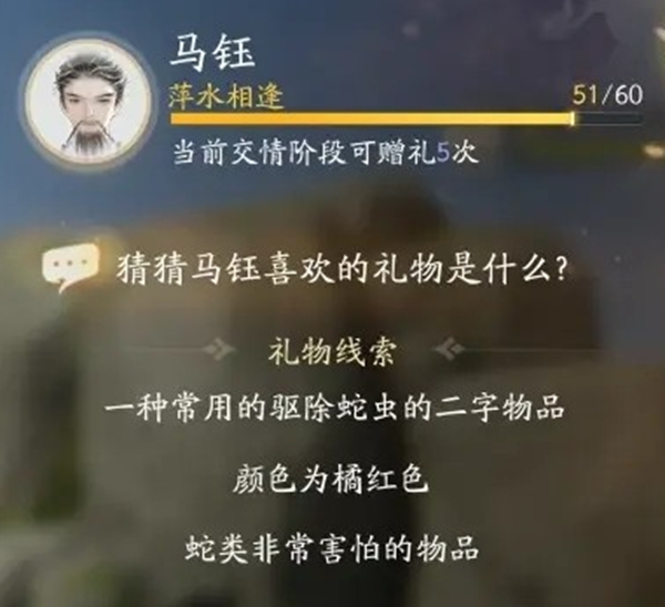 2、玩家可以赠送给马钰喜好度礼物来提升好感度等级,当达到一定的对等级后。