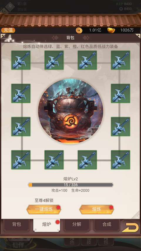 3、玩家在游戏的过程中可以获得大量的装备,一些多余的低级装备可以通过背包进行熔炼,获得大量金币、宝石、经验等。