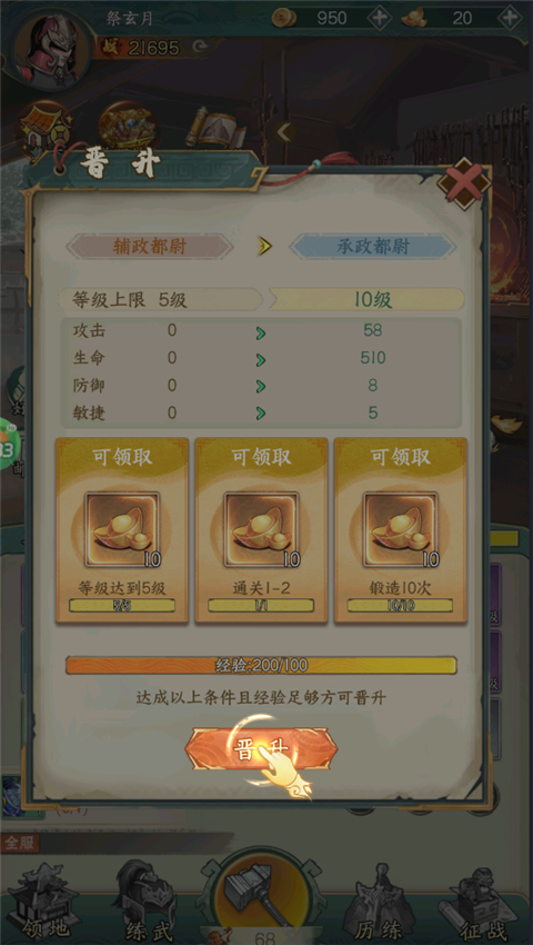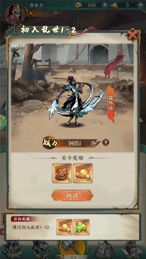 3、点击三国霸业挑战关卡获得资源道具,其中有武力等级需要的道具。
