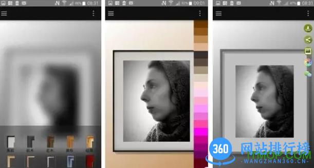 3.手指从屏幕底部边缘向上滑动可以选择边框的不同形式,点击边框位置可以调整背景的色彩。满意后点击屏幕右上角三个圆点,就可以对制作好的效果进行保存和分享了。