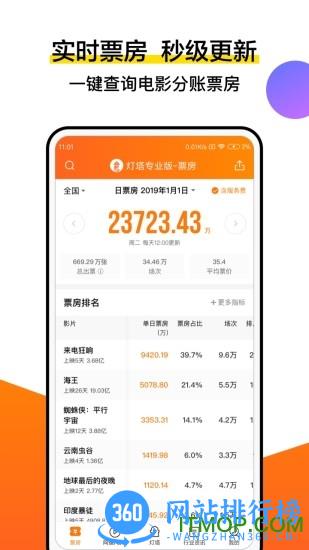 灯塔专业版软件是款掌上查看票房收益,坐席数据等相关详细数据平台,全国上映电影上座率、场次一目了然,致支持查看院线、上映日历、营销指数、行业数据等八大功能欢迎感兴趣的朋友来下载体验!
